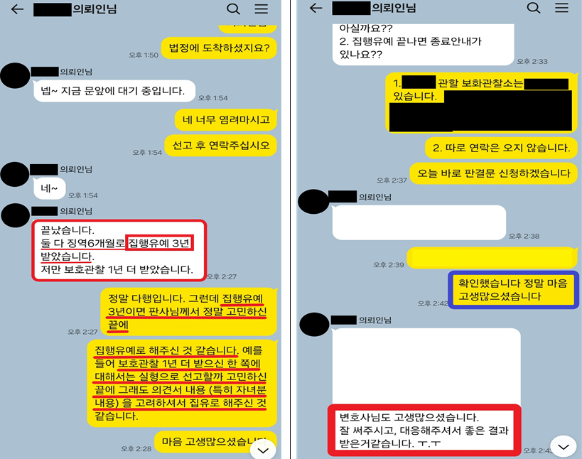 본 사건은 경찰, 검찰 단계에서 변호인의 도움을 받지 못하여 결국 재판까지 갔으나, 다행히도 뒤늦게라도 변호인의견서를 제출하여 둘 다 집행유예로 종결한 사안입니다. 유사한 상황에서 처하여 부부 2분이, 아니면 부자 간에 피의자가 된 상황이라면 연락주십시오! 전과남지 않게 도와드리겠습니다.