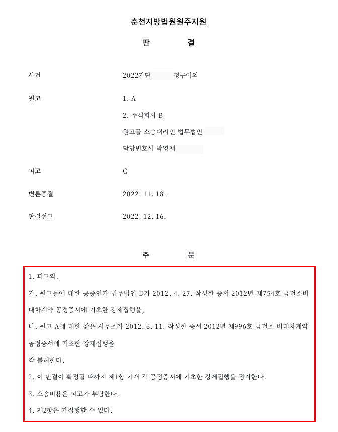 ①사건명 : 공정증서 강제집행 저지 청구이의 승소 / 청구이의 [원고 대리]