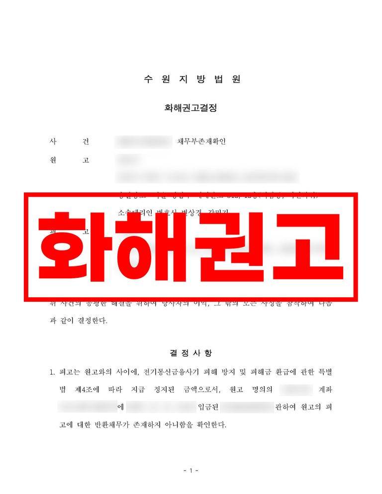 이후 본안 소송에서도 의뢰인의 거래가 보이스피싱 범죄에 가담한 것이 아니라는 점이 인정되어 화해권고결정으로 사건이 마무리되었습니다.