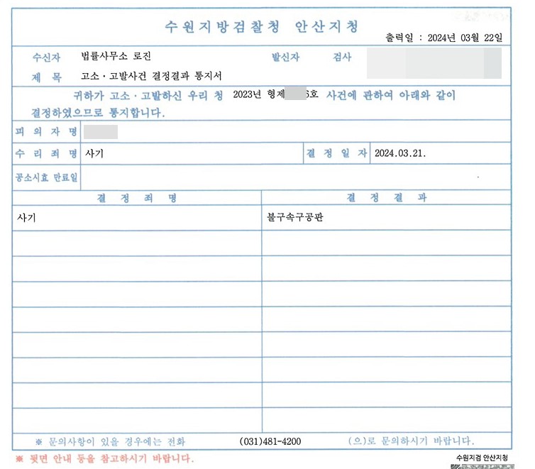 <고소사건 결정결과 통지서>