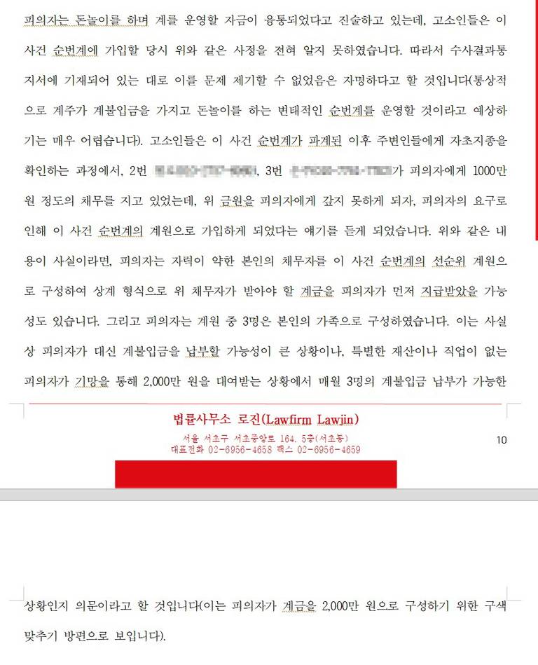 갯돈 사기를 담당해보면, 계주는 보통 '돈놀이'를 하는 사람들이 많습니다. 계원으로부터 받은 계금을 본인이 관리하면서 계금을 다른 사람에게 빌려주고 고리의 이자를 받는 등 계금을 자신의 돈과 혼용하여 사용하는 경우가 많습니다. 문제는 여기에서 발생합니다. 돈을 빌려준 계주가 돈을 받지 못할 경우, 계주는 다른 순번계를 조직하여 돈을 갚지 못한 사람을 선순위 계원으로 가입케 합니다. 그리고 계주는 자신에게 돈을 갚지 못한 위 선순위 계원이 받을 곗돈을 자신이 받는 형식을 진행합니다. 물론 위 선순위 계원을 계속 계금을 분납해야 하지만, 경제적 여력이 없기 때문에 계금을 내지 못하고, 결국 순번계는 파계되는 형식입니다. 계주는 물론 변명거리가 있습니다. 선순위 계원들이 곗돈을 타고 계금을 불입하지 못하였다는 것인데요. 본 건 피고소인도 이와 같은 핑계를 대었습니다. 사건의 내용을 구체적으로 살펴보도록 하겠습니다.