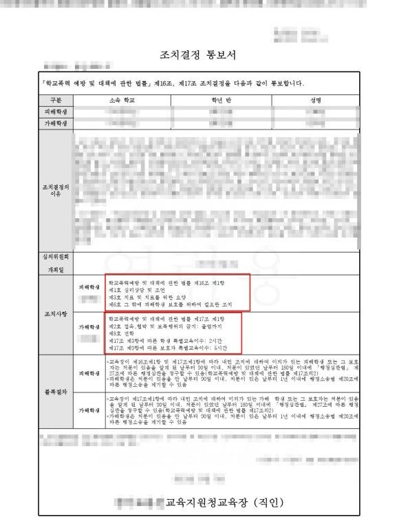 학폭위에서는 의뢰인의 자녀에 피해학생의 보호 조치로 1호*3호*6호 처분을 내렸으며, 가해자에 가해 학생에 대한 조치로 2호(피해 학생에 대한 접촉 협박 및 보복행위의 금지)*8호(전학) 조치 등을 내렸습니다.