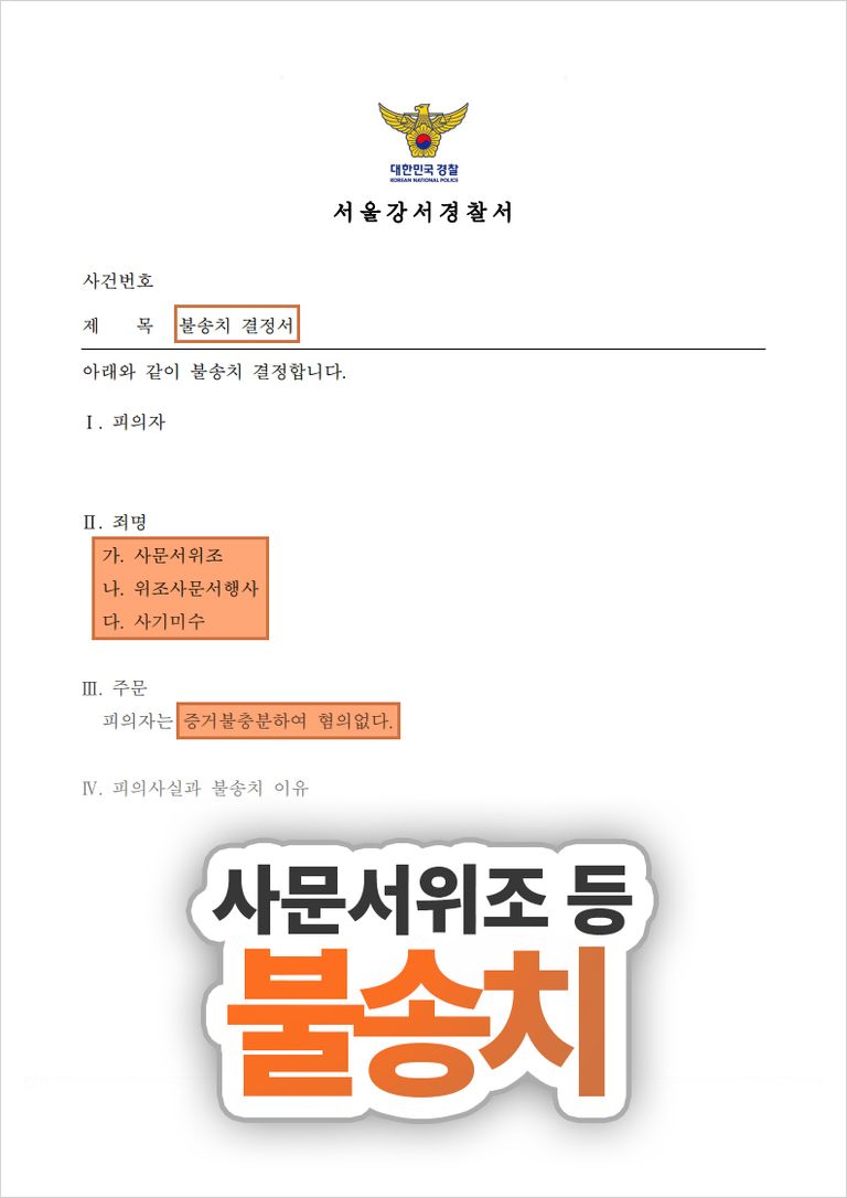 의뢰인의 모든 혐의에 대해 '증거불충분 혐의없음'으로 불송치 결정을 내렸습니다.