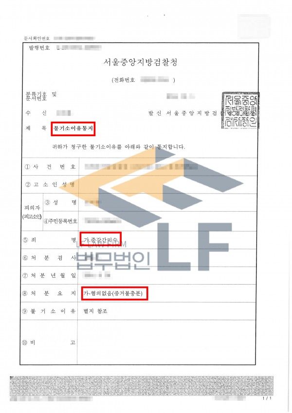 수사 기관에서는 본 변호인의 의견을 수용하여, 의뢰인에 혐의없음(증거불충분)처분을 내렸습니다.