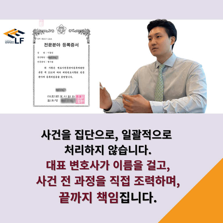 이처럼 사건의 결과가 앞으로의 일상과 삶 전반에 큰 영향을 미칠 수 있는 상황이라면, 사건의 구조와 법리를 정확히 이해하고 대응 전략을 설계할 수 있는 경험이 풍부한 형사전문 변호사의 조력을 받는 것이 보다 현실적인 선택이 될 수 있습니다.