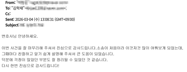 의뢰인께서 감사 후기를 보내주셨습니다.