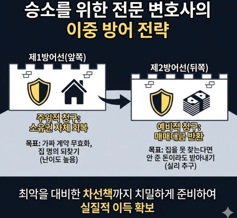 부동산 소송은 단순히 법전의 문구를 해석하는 것이 아닙니다. 할 수 있는 모든 주장을 고안하고, 상대방이 제출한 주장과 증거자료에서 모순점을 찾아내는 집요함이 필요합니다. 이 사건에서도 무모하게 주위적 청구에 집중하기 보다는, 실익을 챙길 수 있는 예비적 청구에 집중하여 의뢰인에게 주거의 안정과 매매대금 확보라는 경제적 이득을 동시에 가져다 드릴 수 있었습니다.