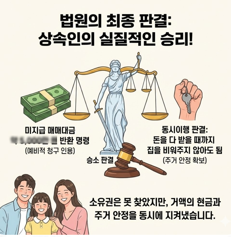 만약 예비적 청구와 동시이행항변이 인정되지 않았다면, 의뢰인은 매매대금을 받는 것은 고사하고 아파트에서 살던 기간 동안 차임 상당액에 해당하는 거액의 돈을 피고에게 물어주고 집에서 쫓겨날 수도 있었습니다. 의뢰인들은 주거의 안정성과 매매대금 확보, 부당이득 반환의무 면제라는 세마리 토끼를 잡을 수 있었습니다.