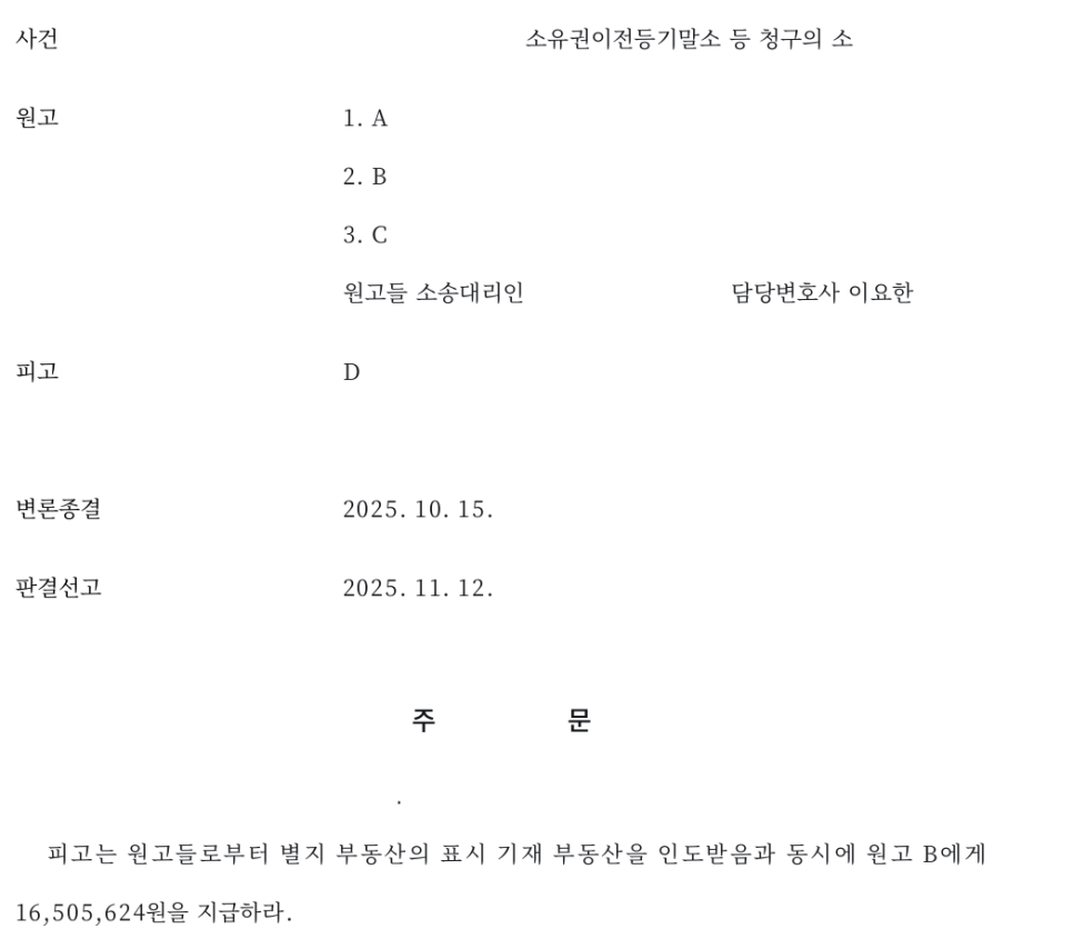 재판부는 저의 예비적 주장(매매대금 반환청구)을 받아들여 원고 일부 승소판결을 선고하였습니다. 등기의 추정력으로 피고의 소유권 자체를 말소시키는 것은 실패했으나, 이를 대비하여 예비적 청구를 준비하여 매매대금을 확보하는 성과를 거둘 수 있었습니다.