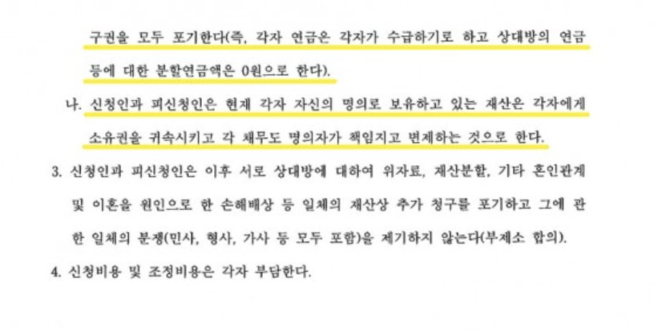 조정기일에는 통역 보조인을 대동하여 외국인 배우자와 충분한 소통을 진행했고, 최종적으로 각자 재산은 각자 보유하고 연금 분할 청구권도 행사하지 않는다는 조항을 합의서에 포함시켰습니다.