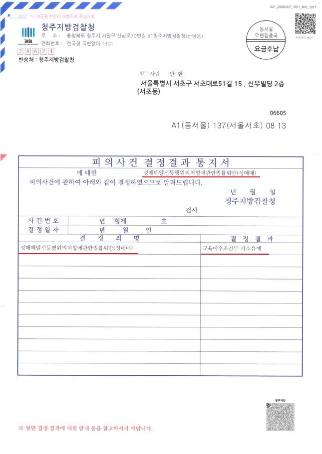의뢰인님께서는 최근 성매매 처벌 수위에 비추어 벌금형이 선고될 위험이 높은 상황이었습니다. 그러나 앞서 말씀드린 다양한 방법으로 경찰, 검찰 수사 단계를 신중히 진행하였고 이에 청주지방검찰청 부천지청은 의뢰인님에게 "기소유예"처분을 내렸습니다.