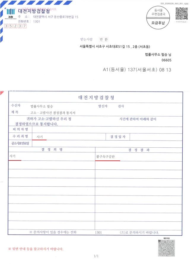 법리와 판례를 토대로 작성한 고소장, 경찰서 고소인 진술 및 대질신문 과정에 동행하여 의뢰인님의 진술을 도와드리고, 지속적으로 수사 기관이 필요한 내용을 준비, 제출한 결과 의뢰인님께서는 피해금액 전액을 변제받으셨습니다. 그러나 사기죄는 합의를 하거나 피해 회복이 이루어졌더라도 혐의가 인정되면 처벌이 이루어지기 때문에 대전지방검찰청은 피의자의 사기 혐의를 인정하여 기소하였습니다.