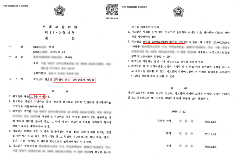 합의 이후 본 변호인은 보석을 신청하게 되고, 다행히 재판부는 보석보증보험증권 첩부의 보증서로 갈음하도록 하는 보석 인용 결정을 내렸습니다. 여기에 보증보험에서도 마약, 성범죄 사건의 경우 보증서 발급을 잘 하지 않는 경향이 있으나, 다행히 본 사건에서는 1억원의 보증금 대신 보증서 발급으로 갈음하게 되었습니다.