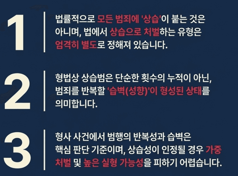 즉 단순히 몇 번 반복되었다는 이유만으로자동으로 상습범이 되는 것은 아닙니다.