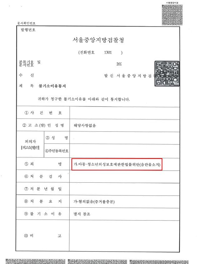 저의 주장이 전부 받아들여져, 검사는 혐의없음(증거불충분) 처분을 내렸습니다. 아동청소년의성보호에관한법률위반(성착취물소지)는 형사처벌 전력이 남는 것은 물론이고, 사회봉사, 신상정보등록 등의 부가처분이 붙게 됩니다.