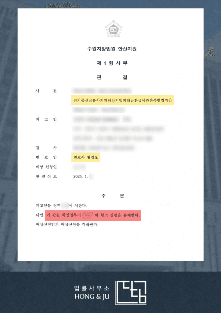 이로써 의뢰인의 보이스피싱 현금수거책 사건은 '집행유예' 판결로 법정 구속 없이 종결됐습니다.