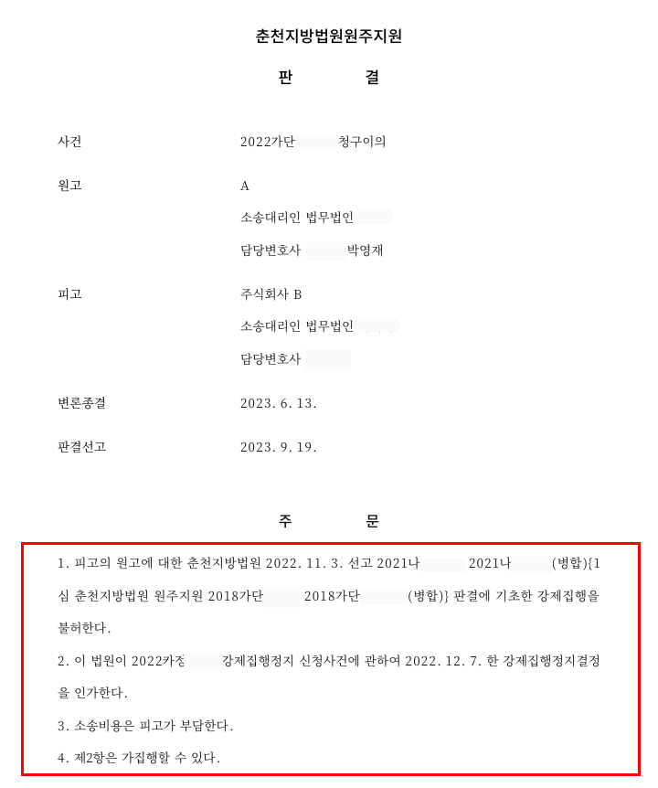 ⑤판결 : 법원은 의뢰인의 주장을 받아들여 채권자가 이전 판결에 기초하여 진행하려던 강제집행을 허용하지 않는다는 판단을 내렸습니다. 또한 이미 내려졌던 강제집행정지 결정을 그대로 인가하면서 의뢰인이 더 이상 해당 판결을 근거로 한 집행을 당하지 않도록 하였습니다. 그 결과 의뢰인은 강제집행 위험에서 벗어날 수 있었습니다.