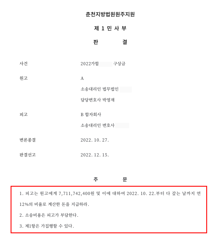 ④변호인의 조력 : 본 법률대리인은 공동운영 약정의 체결 경위와 사업 운영 구조를 구체적으로 정리하여 피고 역시 공동사업의 당사자로서 손실 분담 의무를 부담한다는 점을 강조하였습니다. 또한 관련 민사소송의 판결 내용, 회생절차 진행 상황, 채권 관계 및 실제 금전 지급 경위를 체계적으로 정리하여 제출함으로써 의뢰인이 부담한 금전이 공동사업에서 발생한 손실이라는 점을 명확히 입증하였습니다. 이를 통해 피고에게 약정에 따른 책임이 존재한다는 점을 법원에 설득력 있게 주장하였습니다.