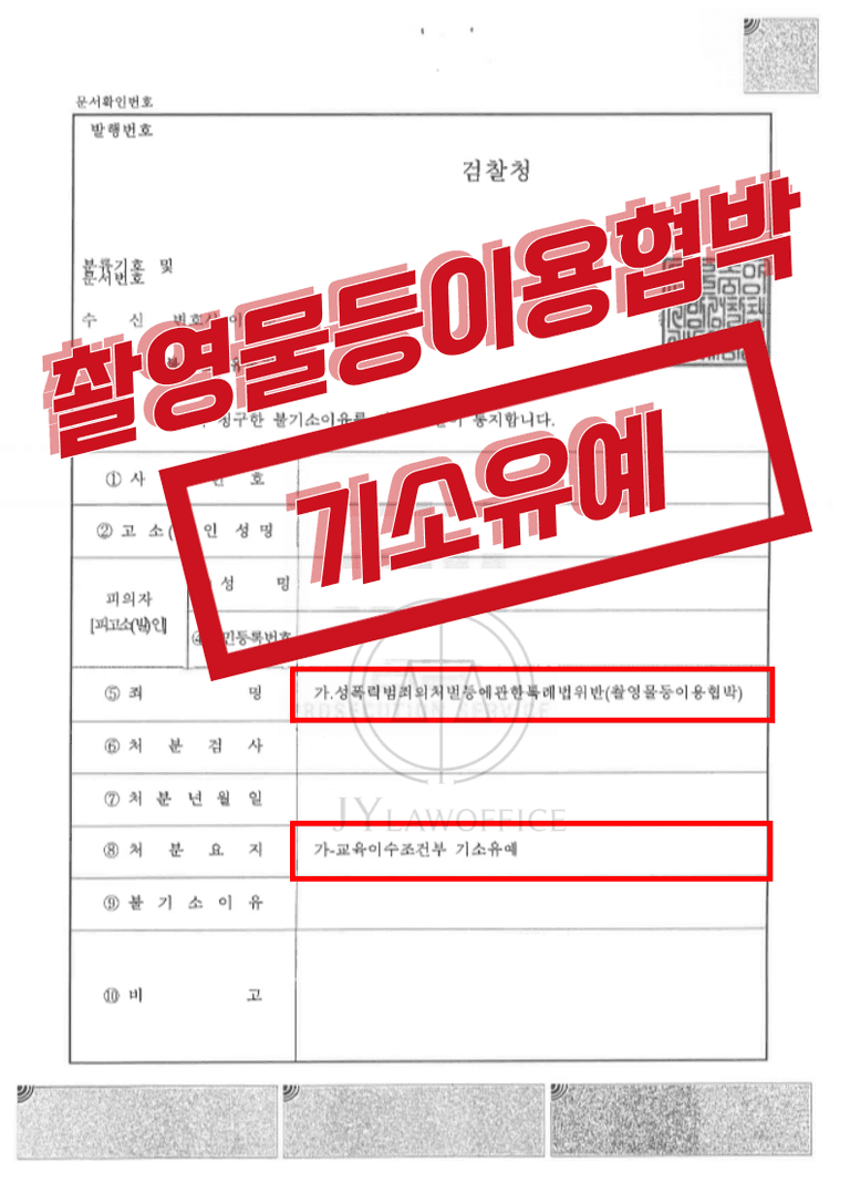 의뢰인은 이와 같은 본 성범죄전문변호사의 조력에 따라, 의뢰인은 촬영물등이용협박 혐의에 대해서 기소유예의 불기소 처분을 받고 무사히 사건을 종결시킬 수 있었습니다.