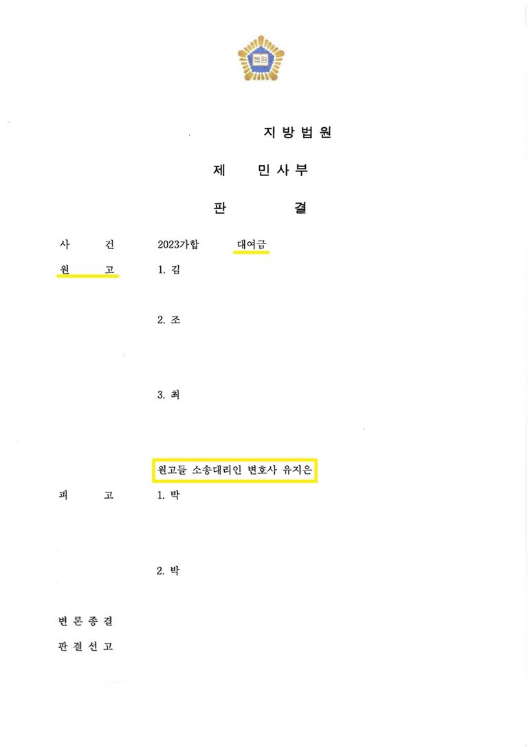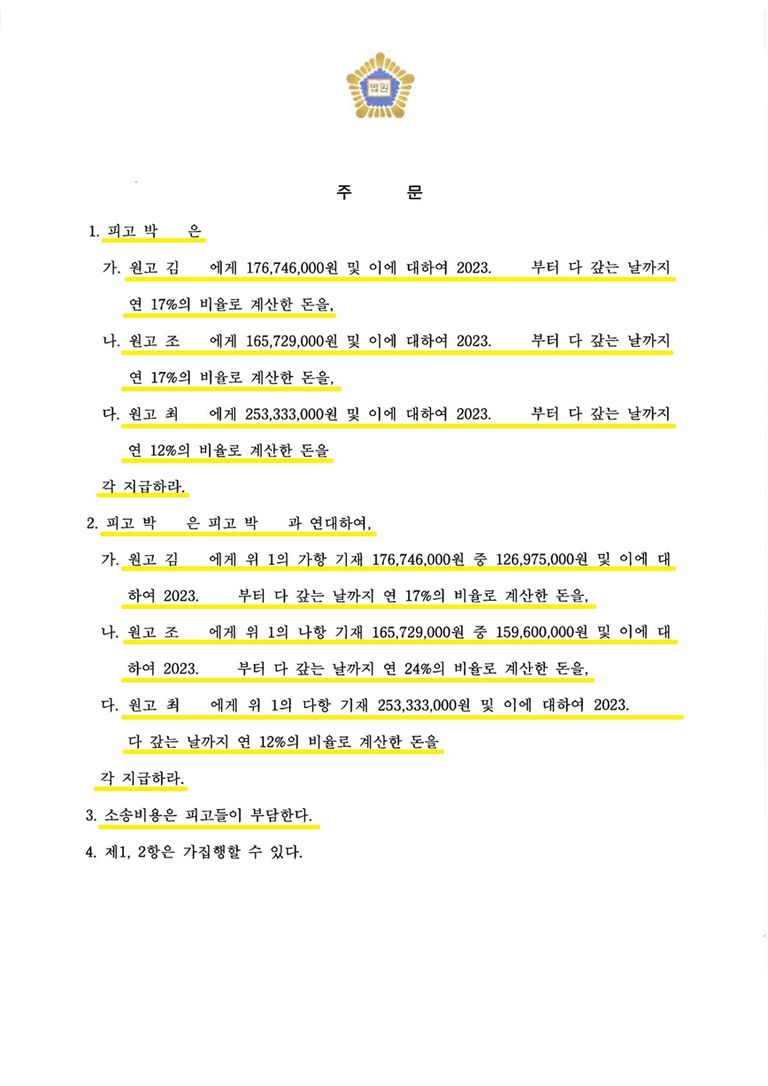 증인신문을 하는 등 치열한 다툼 끝에 저희가 청구한 내용 그대로 전부 승소하였고, 소송비용까지도 상대방들이 부담하는 것으로 성공적으로 마무리 한 사안입니다.