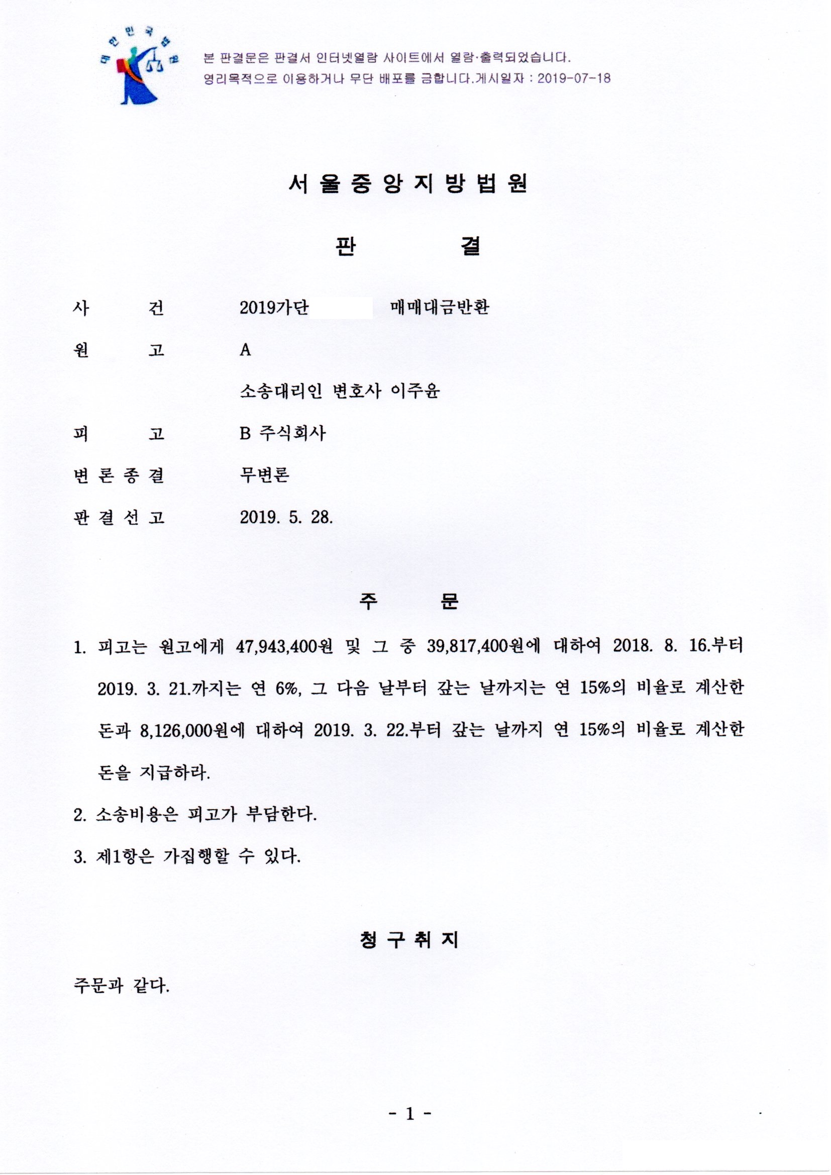 상담 후 의뢰인께서 들고 오신 자료를 다각도로 검토한 결과 "해볼만 하다"는 결론을 내리고, 매도인인 경매업체 대표이사와 임원 등을 사기죄로 고소하고 민사소송을 통해 매매대금 반환과 위약금을 청구했습니다.