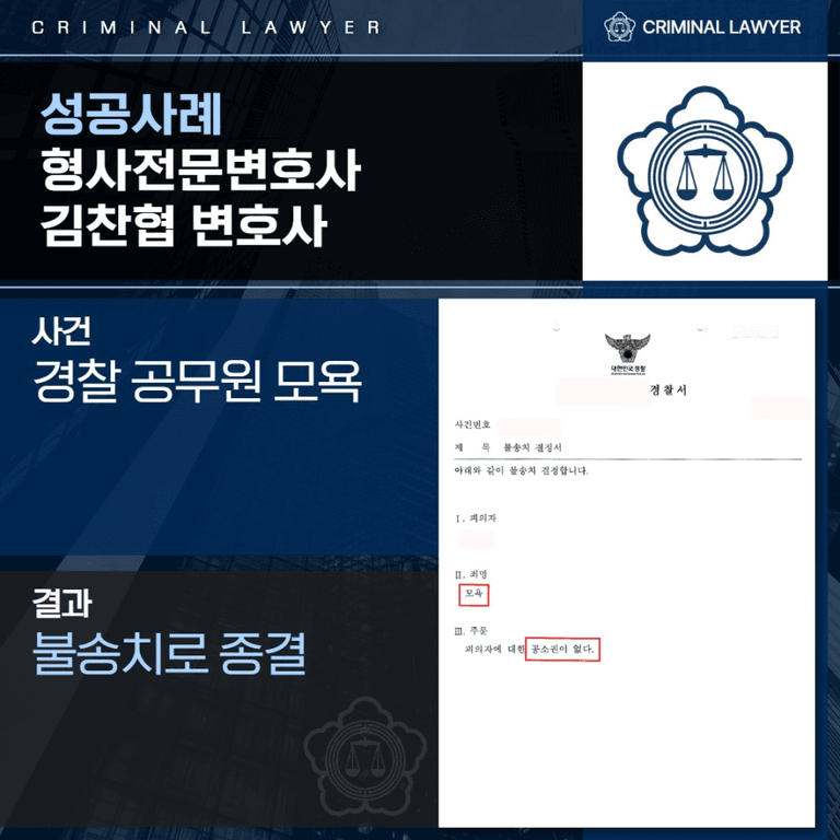 이는 의뢰인의 발언 경위, 반성 태도, 피해 경찰관과의 합의가 종합적으로 고려된 결과였습니다. 형사 절차가 더 이상 진행되지 않음에 따라, 의뢰인은 전과 기록이나 추가적인 불이익 없이 사건을 마무리할 수 있었습니다.