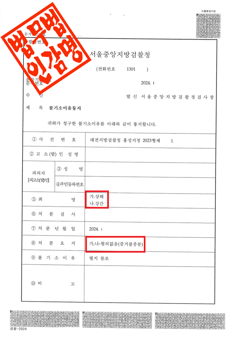 대전지방검찰청 홍성지청은 이 사건에 대해 다음과 같은 사유로 불기소 결정을 하였습니다.