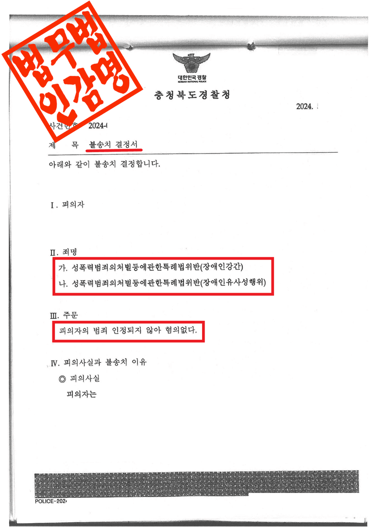 충청북도경찰청은 이 사건에 대해 다음과 같은 사유로 불송치 결정을 하였습니다.