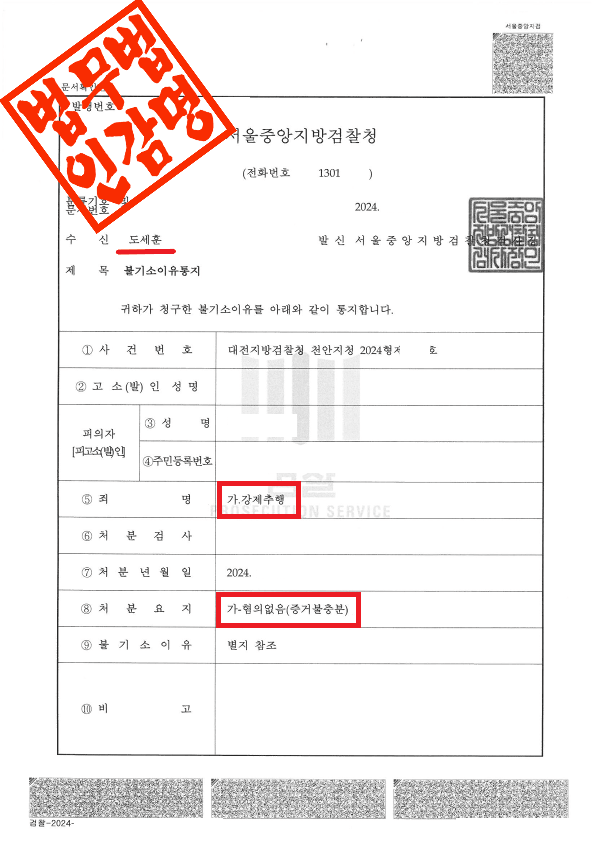 대전지방검찰청 천안지청은 이 사건에 대해 다음과 같은 사유로 불기소 결정을 하였습니다.