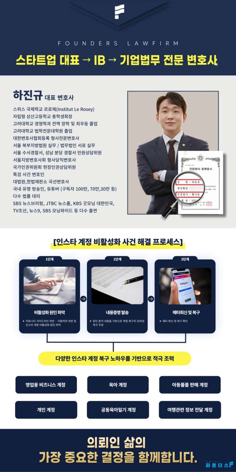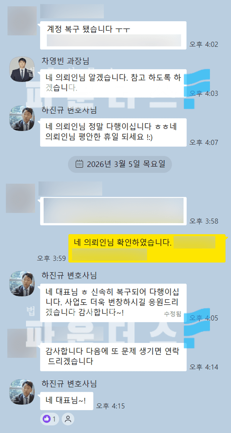 의뢰인은 다시 정상적으로 계정을 운영하며 인플루언서 활동과 비즈니스 활동을 이어갈 수 있게 되었고 오랜 기간 쌓아온 계정의 가치를 지킬 수 있었습니다.