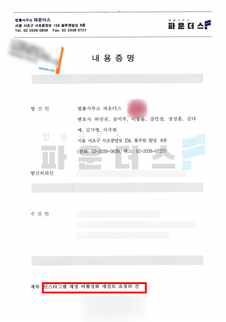 이를 바탕으로 변호인은 민사소송에 준하는 논리 구조로 작성된 내용증명을 인스타그램 측에 발송하여 이번 조치에 대한 재검토를 강력히 요청하였습니다.