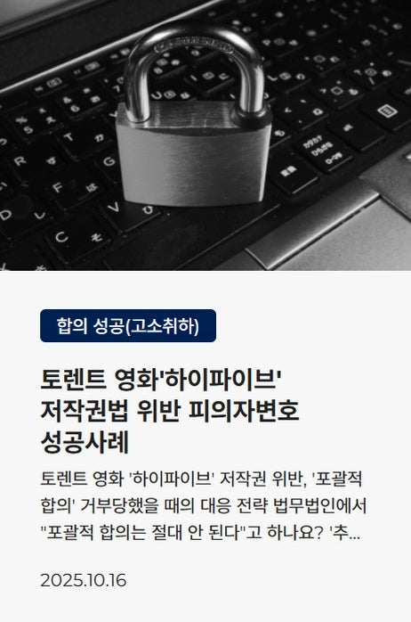 의뢰인은 토렌트로 국내 영화 한 편을 다운로드 받았다가 수개월 뒤 저작권위반 혐의로 고소당했는데요.