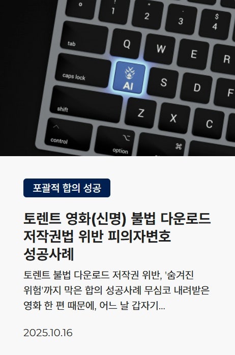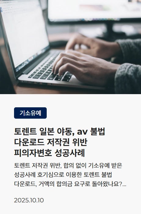 ![[저작권]토렌트 영화 불법다운로드 경찰조사 대응 가이드#토렌트](/_next/image?url=https%3A%2F%2Fd2ai3ajp99ywjy.cloudfront.net%2Fuploads%2Ftitleimage%2Foriginal%2F5d6cae86c7bf11f77118fac6-original.jpg&w=3840&q=75)