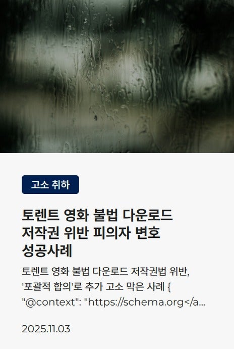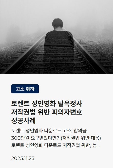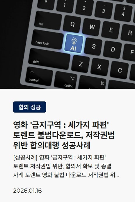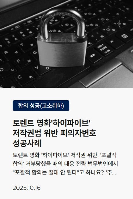 그 결과 최초 제시액보다 크게 낮은 금액으로 합의를 마치고 추가적인 토렌트 저작권 고소 위험 없이 사건을 안전하게 종결할 수 있었습니다.