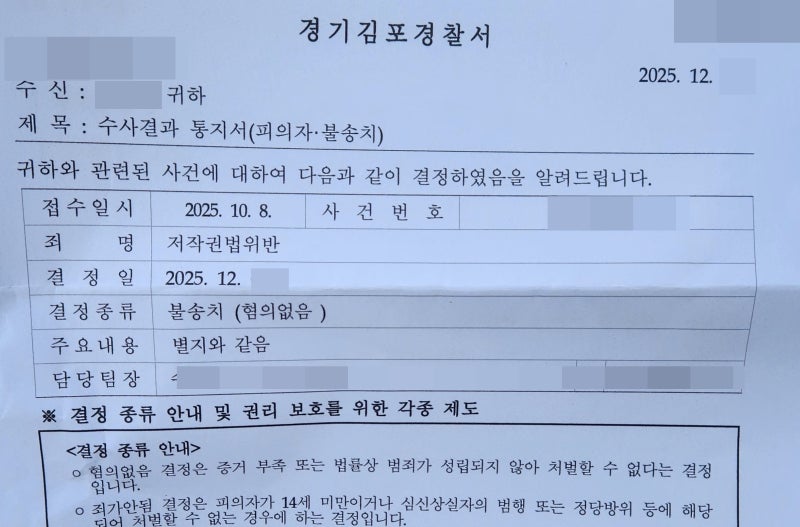 그 결과 경찰은 범죄 성립이 어렵다고 판단해 불송치(혐의없음) 결정을 내렸습니다. 자세한 내용은 <해당 사례> 칼럼에 정리하겠습니다.