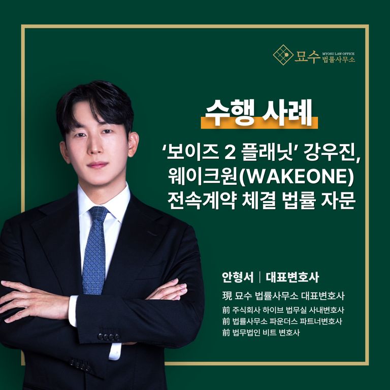 묘수 법률사무소는 오디션 프로그램 ‘보이즈 투 플래닛(Boys II Planet)’ 출연 연습생 강우진이 대형 기획사 웨이크원(WAKEONE)과 전속계약을 체결하는 과정에서 법률 자문을 제공하였습니다.