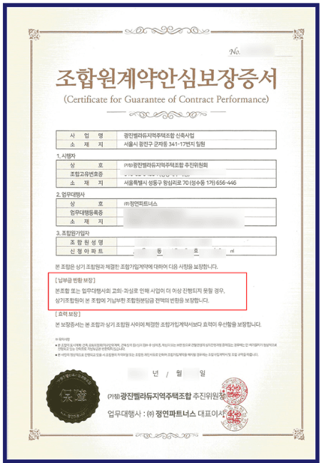 해당 문서는 최동욱 변호사가 전국 각지의 유사 사건에서 다수의 소송을 진행하는 과정에서 이미 법적으로 효력이 인정되기 어렵다는 판단을 받아온 문서입니다. 광진벨라듀 지역주택조합에서 발급된 이 문서는 <계약 안심보장증서>라는 제목으로 작성되어 있으며, “업무대행사의 고의 또는 과실로 인해 사업 진행이 불가능해질 경우 조합원이 이미 납부한 조합원분담금 전액을 반환한다”는 취지의 조건부 전액 환불 내용을 담고 있습니다.