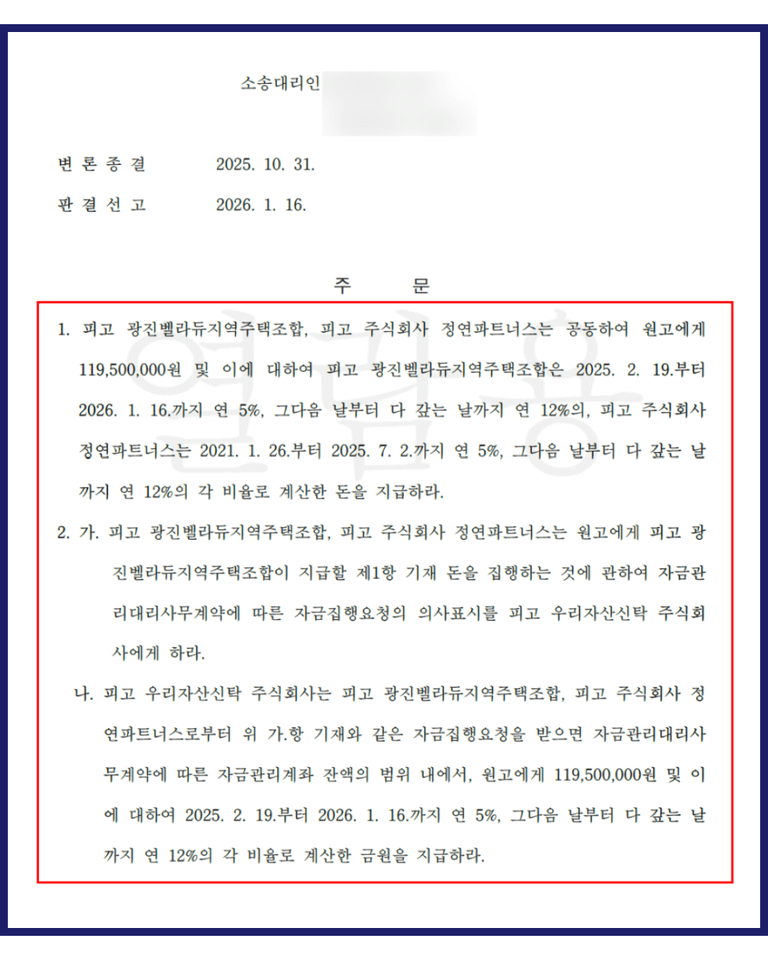 또한 판결금이 실제로 지급될 수 있도록 하기 위해, 우리자산신탁이 곧바로 판결금을 반환할 수 있게 광진벨라듀 지역주택조합과 업무대행사가 우리자산신탁에 자금 집행 요청의 의사표시를 하도록 명하는 내용의 판결도 함께 선고되었습니다.