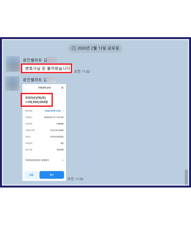 그 결과 의뢰인은 아래와 같이 2026.2.13 피해금 1억 1950만 원 전액을 실제로 반환받게 되었으며, 사건은 성공적으로 마무리되었습니다.