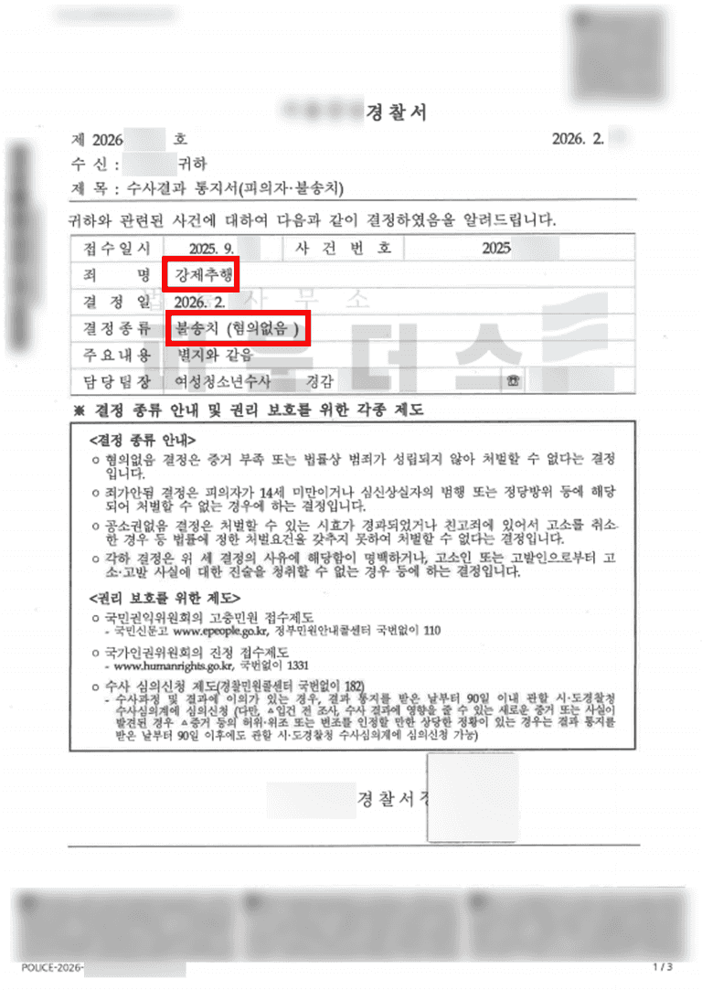 결국 수사기관의 판단은 '증거불충분 불송치'였습니다.