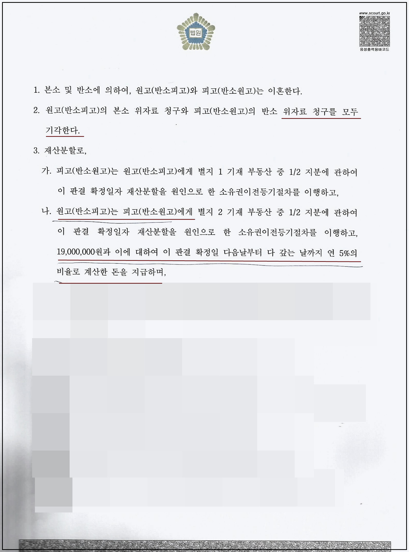 2. 본인은 피고 입장에서 소송을 대리하였는데, 방어 목적에서 위자료 3,000만원, 재산분할로 2,000만원, 두당 100만원을 받으며 애들을 양육 하겠다고 주장하며 반소를 제기함.