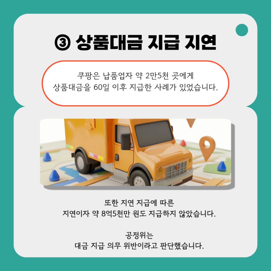 쿠팡은 약 2만 5천 개 납품업자와의 직매입 거래 대금을 법정 지급기한을 넘겨 지급했습니다. 대규모유통업법에 따르면 상품 대금은 상품 수령일로부터 60일 이내 지급해야 합니다. 또한 쿠팡은 지연 지급에 따른 지연이자(연 15.5%) 약 8억 5천만 원도 지급하지 않았습니다.