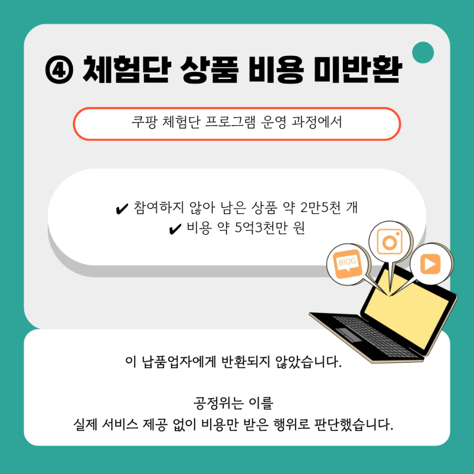 쿠팡은 체험단 프로그램을 운영하는 과정에서 고객이 실제 참여하지 않아 소진되지 않은 상품 약 2만 5천 개에 대한 비용 약 5억 3천만 원을 납품업자에게 반환하지 않았습니다.