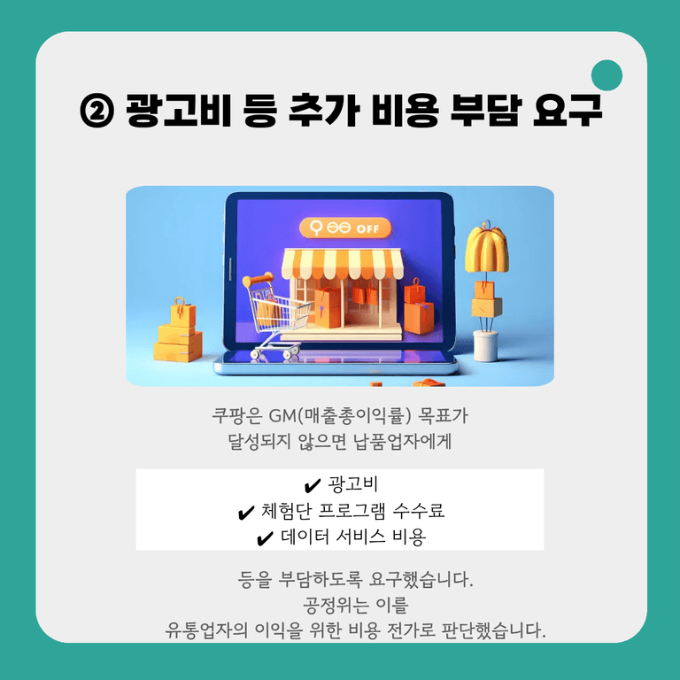 공정위는 이러한 비용이 납품업자의 필요 때문이 아니라 쿠팡의 이익률 유지 목적으로 요구된 것이라고 보았습니다.