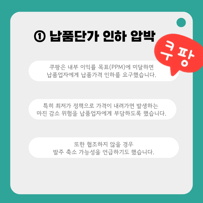 쿠팡은 납품업자와 협의해 설정한 PPM(순수상품판매이익률) 목표에 미달할 경우 납품 가격 인하를 요구했습니다.