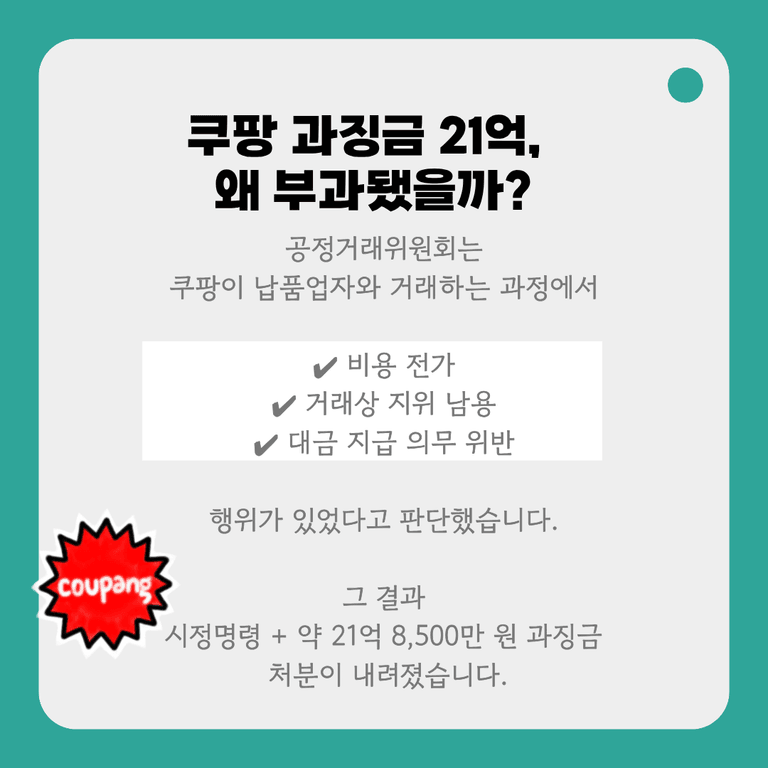 이로 인해 쿠팡은 공정위로부터 시정명령과 함께 약 21억 8,500만 원의 과징금을 부과 받았습니다.