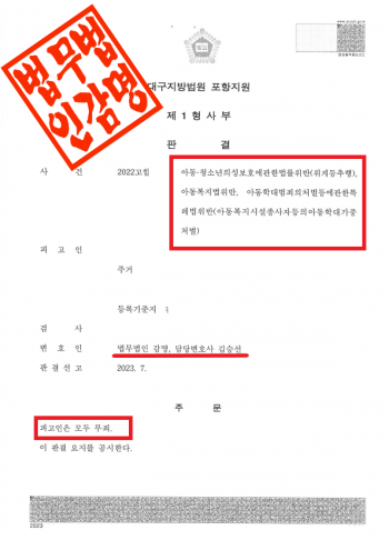 ○ 검사가 제출한 증거들만으로는 피고인이 위력으로 피해자를 추행하고, 성적 학대행위를 하였다는 사실을 합리적 의심 없이 인정하기는 어려운바 이 사건 공소 사실은 범죄의 증명이 없는 때에 해당하므로 형사소송법 제325조 후단에 의하여 무죄를 선고하고, 형법 제58조 제2항 본문에 따라 무죄 판결의 요지를 공시하기로 하고 주문과 같이 판결한다.