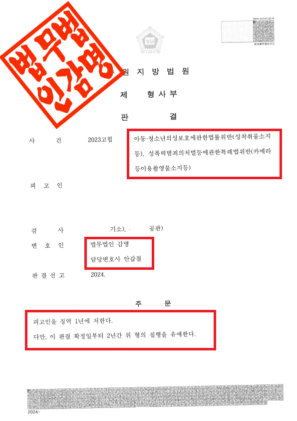 결과적으로 재판부는 범행 규모가 크지만 당 법인이 제출한 피고인의 진지한 반성 태도와 재범 방지 노력을 깊이 참작하여, 의뢰인에게 실형이 아닌 집행유예를 선고하였습니다. 자칫 철창신세를 지고 평생 성범죄자 낙인이 찍힐 뻔했던 의뢰인은, 실무에 밝은 전문가의 신속한 초기 대응 덕분에 무사히 일상으로 돌아올 수 있었습니다.