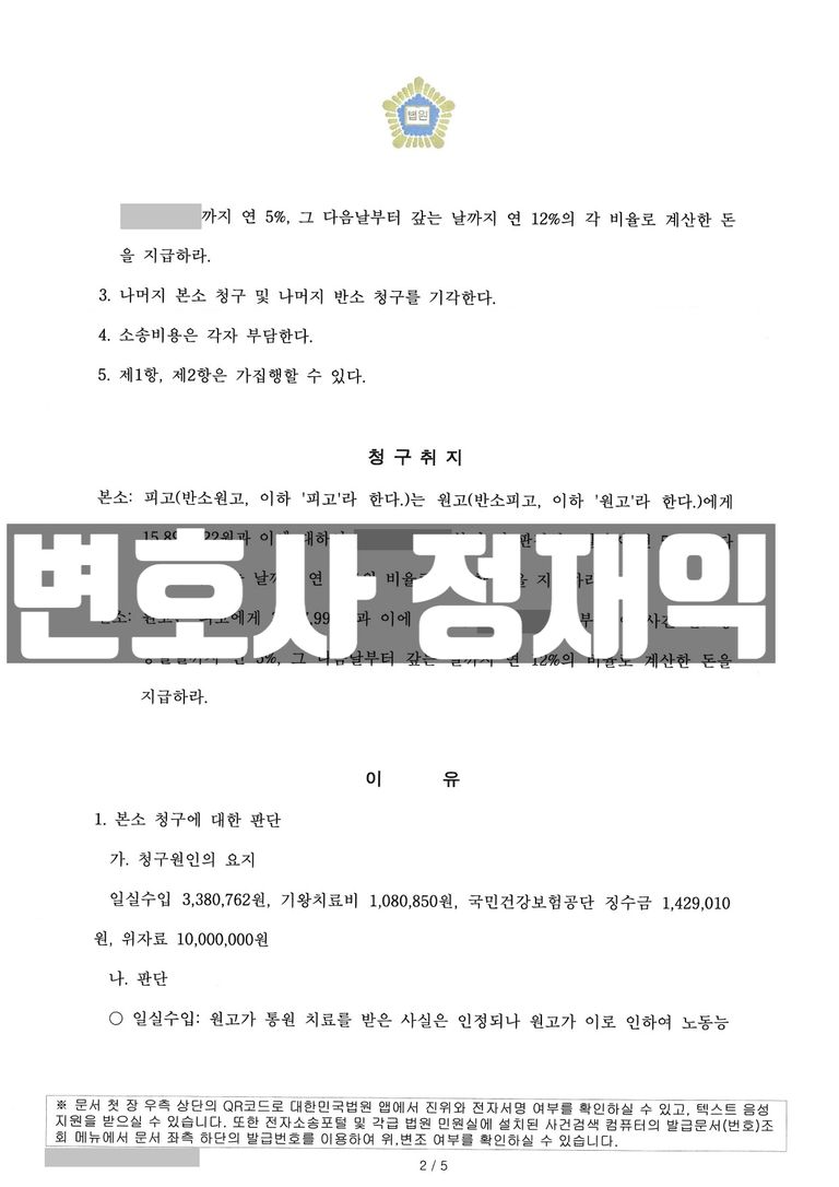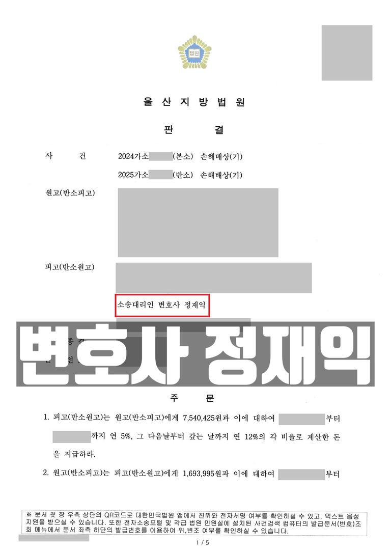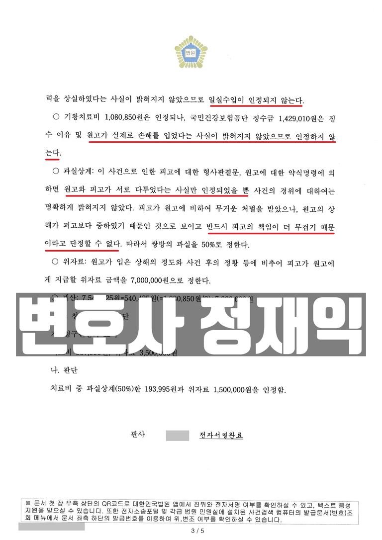 담당 재판부는 정재익 변호사의 변론을 모두 받아들여 B씨의 일실수입과 국민건강보험공단 환수금 청구를 인정하지 않았고, 과실상계 비율 역시 K씨가 형사판결에서는 더 중한 처벌을 받았음에도 5:5 과실로 조정하였습니다. 그리고 정재익 변호사의 반소 청구 또한 인용되어, 결과적으로 B씨의 청구 금액의 1/4 수준에 해당하는 금액으로 방어에 성공하였습니다.