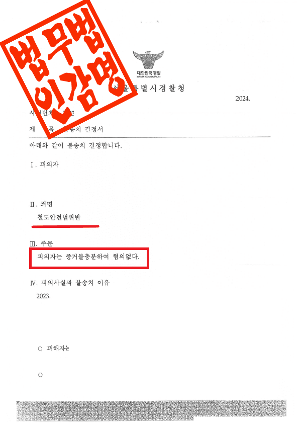이에 당 법인은 현장 상황을 객관적으로 재구성하는 변호 전략을 세웠습니다. 첫째, 출퇴근 시간대 만원 전철의 특성상 발생한 불가피한 접촉일 뿐, 추행의 고의성이 전혀 없는 일상적인 접촉임을 법리적으로 강력히 주장했습니다. 이를 통해 수사기관을 설득하여 죄명을 강제추행에서 상대적으로 형량이 낮은 철도안전법위반으로 우선 변경시키는 데 성공했습니다.